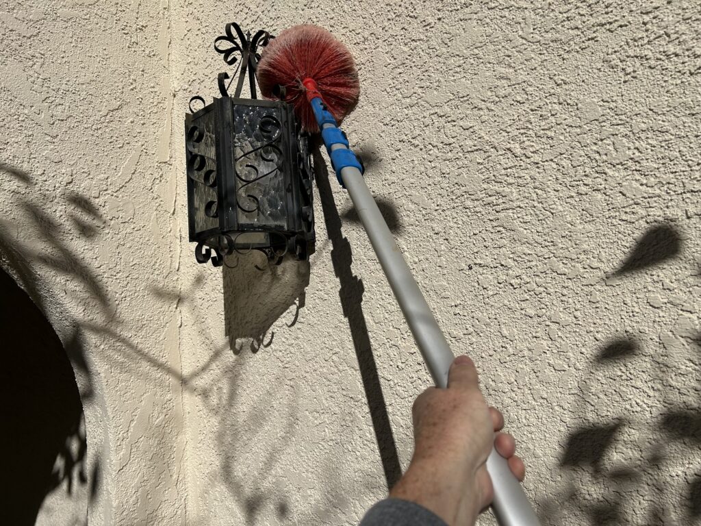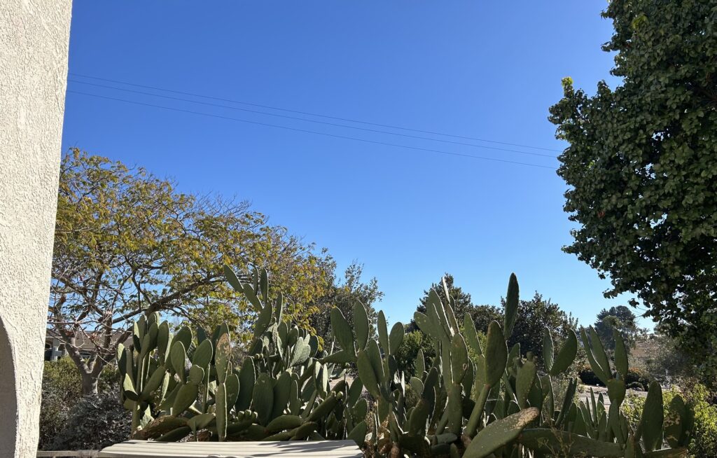 Enjoying the beautiful view from the yard, not so much the clump of Cactus but the perfect clear sky, Window Cleaners love their office!